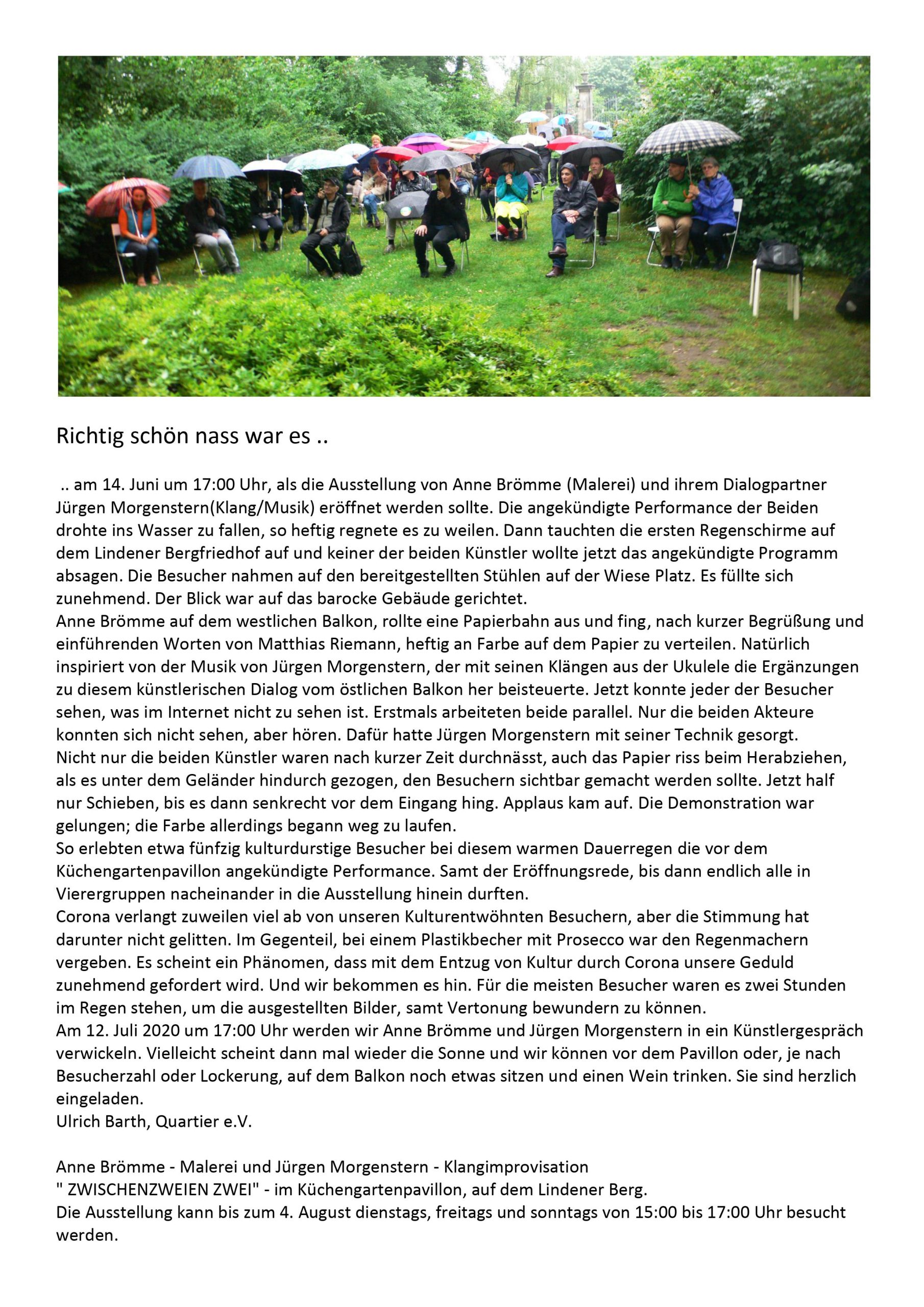 14.6.2020 Die Eröffnung - Die Rede von Matthias Riemann Matthias Riemann Rede zur Eröffnung der Ausstellung „Zwischenzweien zwei“ Anne Brömme und Jürgen Morgenstern Küchengartenpavillon Hanover, 14.6.2020 Es gilt das gesprochene Wort! Sehr geehrte [...]